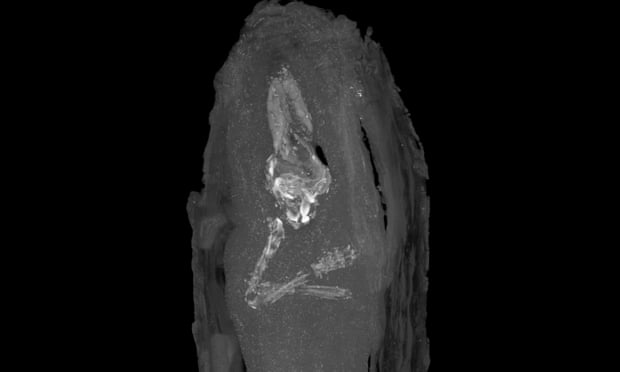 El examen utilizando imágenes de rayos X en el Museo Fitzwilliam fue concluyente, y sugirió que podría contener un pequeño esqueleto. Por lo tanto, se decidió escanear con micro CT (tomografía computarizada) el pequeño bulto en el Departamento de Zoología de la Universidad de Cambridge. Las imágenes de cortes transversales dieron las primeras imágenes de los restos de un pequeño cuerpo humano dentro de los envoltorios, los cuales permanecen inalterados.