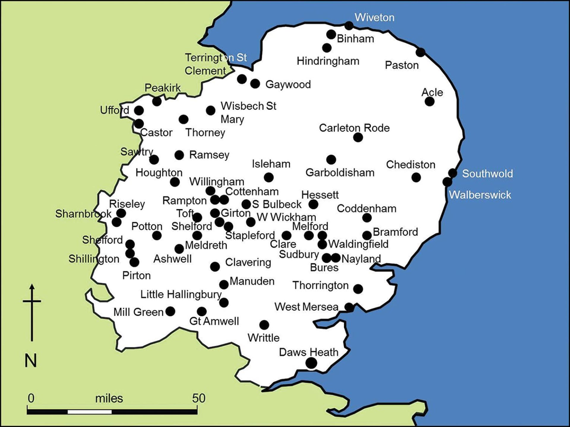 Algunos historiadores del siglo XX han comenzado a cuestionar la escala de la epidemia, en parte porque se han encontrado relativamente pocas fosas de enterramiento relacionadas con la plaga, pero la investigación de Lewis confirma los más nefastos relatos medievales: en conjunto su análisis a lo largo de East Anglia muestra un decrecimiento medio de la población del 44,7% en el 90% de los asentamientos muestreados. El patrón es irregular: por ejemplo Norfolk muestra una caída del 65%, hasta un 85% en Gaywood y Paston, datos mucho peores que los de Essex o Suffolk. Antes de la Peste Negra, Great Shelford en Cambridgeshire era un creciente asentamiento medieval, extendiéndose a lo largo de más de un kilómetro a lo largo de su calle principal, después se redujo a un fila única de 200 metros de casas junto a la iglesia.