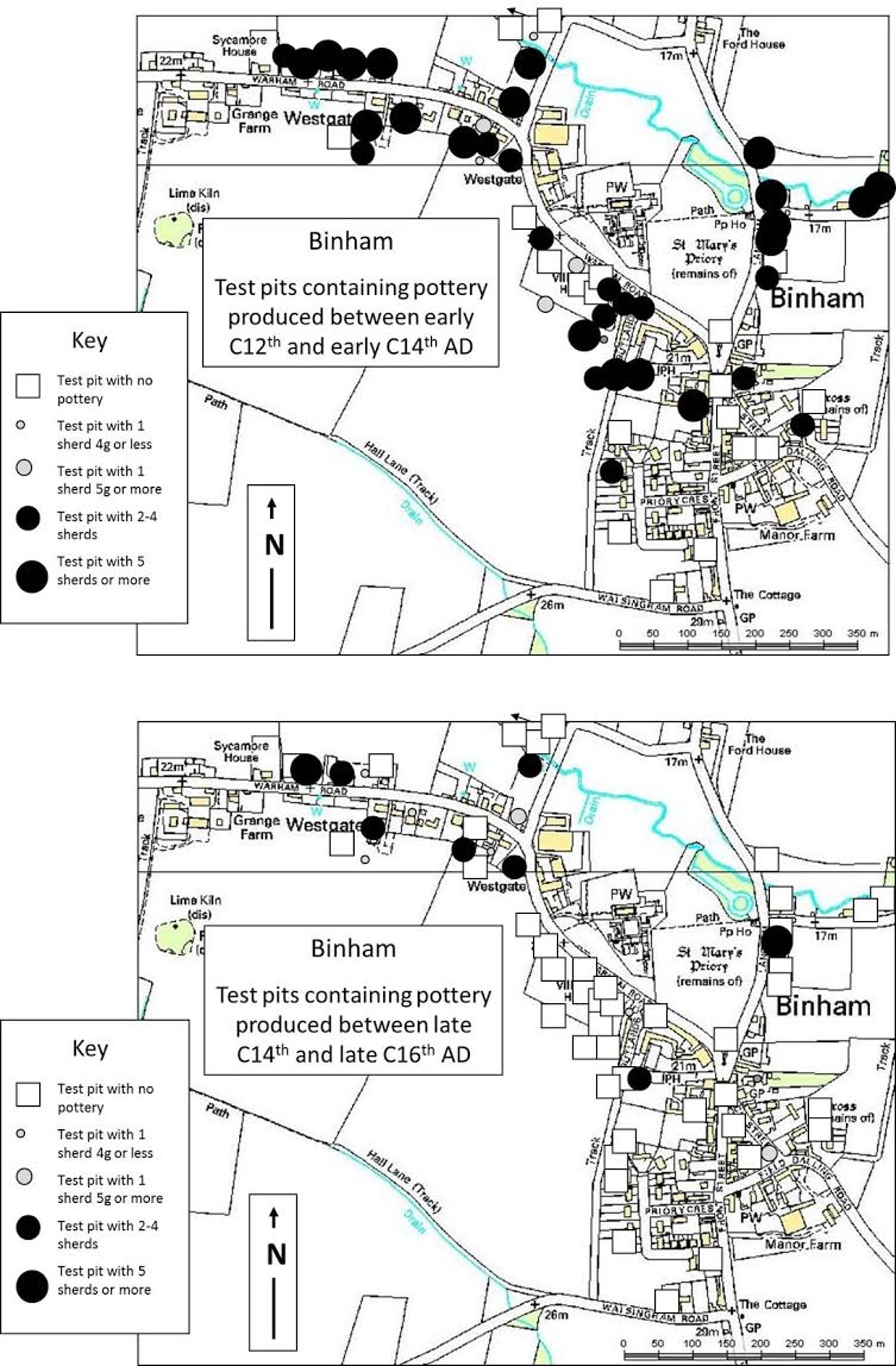 La profesora Carenza Lewis ha analizado decenas de miles de fragmentos de cerámica datable, excavada en casi 2.000 pozos de sondeo en el este de Inglaterra. Los trozos, obtenidos de niveles relacionados con los periodos anterior y posterior a la Peste Negra, sugieren un colapso de la población de en torno al 45%. En algunas áreas, como Binham en Norwich donde hubo una caída del 71% en la cantidad de cerámica, las cifras son mucho peores.