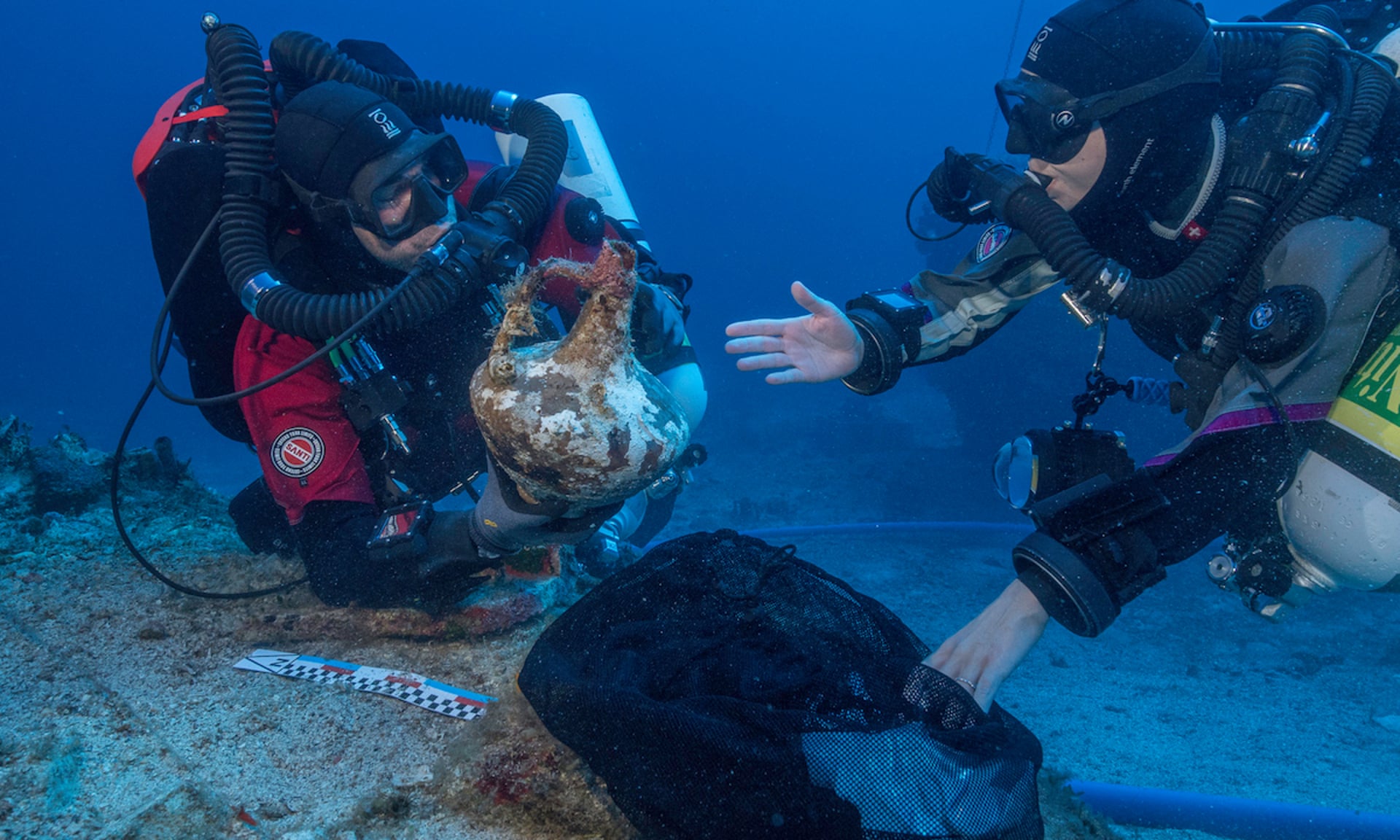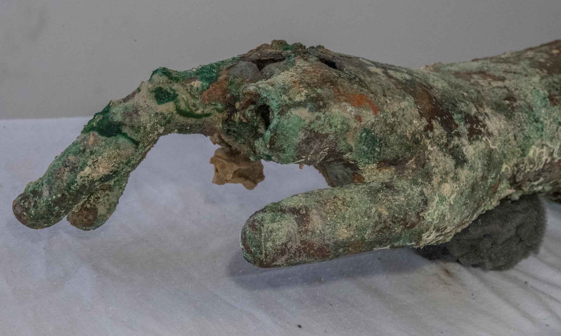 Los buceadores encontraron el brazo derecho, cubierto de concreciones y óxido verde, bajo medio metro de sedimento en la loma de rocas diseminadas donde el barco y su carga descansan en la actualidad. La enorme nave, quizá de 50 metros de eslora, navegaba desde Asia Menor hacia Roma en el año 1 a.C. cuando naufragó cerca de esta diminuta isla entre Creta y el Peloponeso.